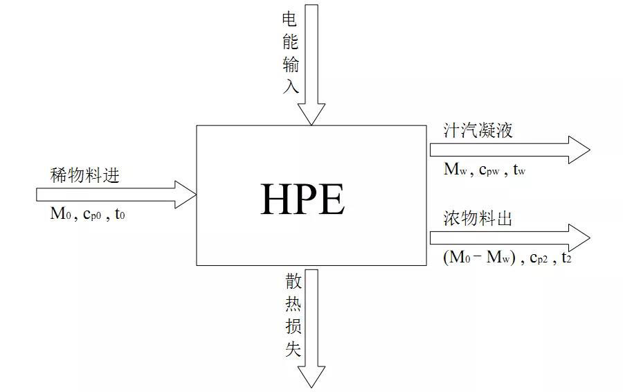 稀物料通过溶液泵进入HPE系统,被机组生产的80-90℃高温蒸汽加热,稀物料中的水分在控制的真空度下,以低于100℃的温度下蒸发,蒸发的水蒸汽在热泵机组的蒸发器里冷凝成凝结水排出,同时热泵机组吸热得到热源,实现循环;最终达到溶液浓缩的目的。