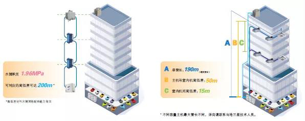 另外管长分配由水侧与冷媒侧两部分承担,水侧承压高达1.96MPa,相当于200m高楼层的落差压,另外,冷媒侧管长安装自由度也很大,并确保管长衰减进一步优化,主机机房设置选择更加灵活自由。