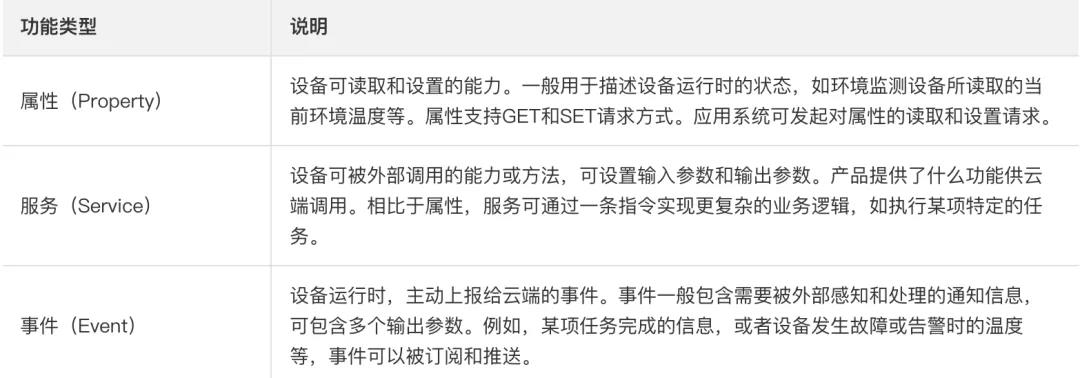这是一种相对简单的分类方法,尤其在智能家居这种产品形态功能比较容易定义的应用场景下,通过概括产品的基本属性、外部服务和可上报事件,基本可以将设备产品描述清楚。几家主流 IoT 产品的做法,也大同小异。其实都是来自同一个出处——W3C万维物联网联盟的WoT TD标准。