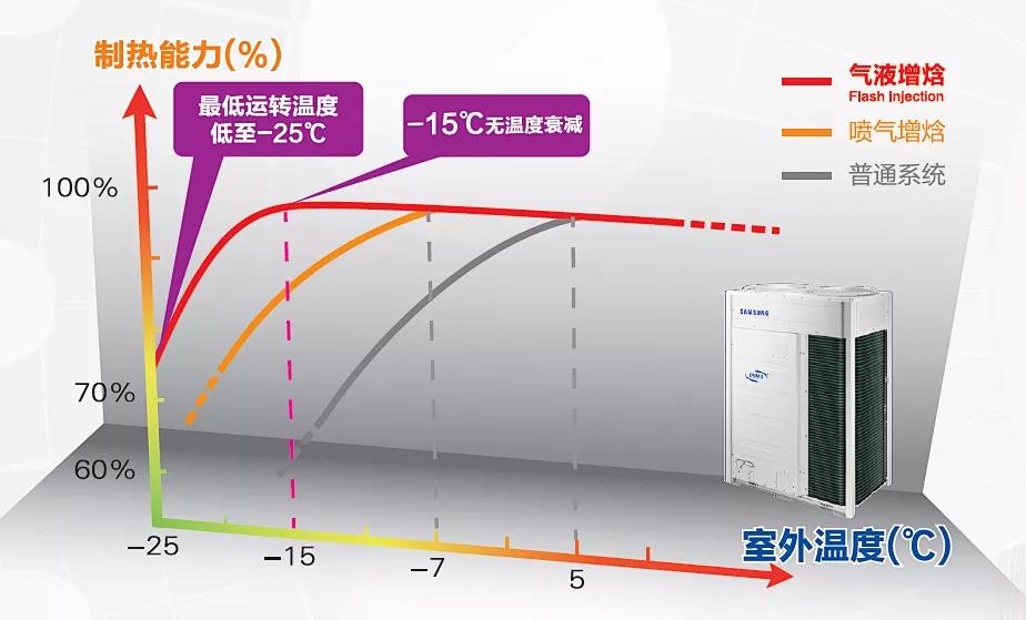 一台好的压缩机,将轻松驱动整个空调系统,机器制冷(热)效果显著且稳定。强劲的制热功能,一直都是三星中央空调的性能亮点,经过技术不断的升级,推出高效的气液增焓技术。