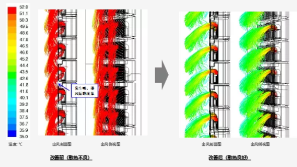 通过气流分析模拟发现,原设计空调散热存在明显的出回风短路的情况,室外机排出的热空气又被吸入,造成排风的温度进一步升高,形成恶性循环。在这种情况下,空调的制冷制热效果会下降,空调机组的耗电量会升高,严重时甚至出现热保护的情况。