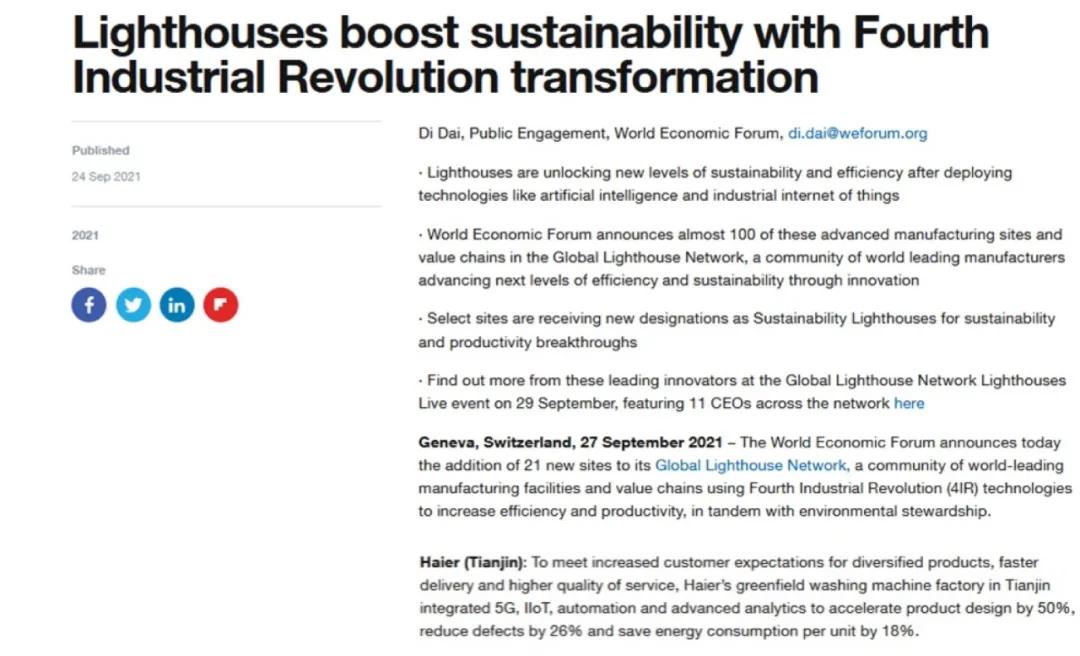 9月27日,世界经济论坛与世界级领先的全球管理咨询公司麦肯锡公布第7批全球“灯塔工厂”名单,天津海尔洗衣机互联工厂入选,成为全球第一家洗衣机行业端到端“灯塔工厂”。