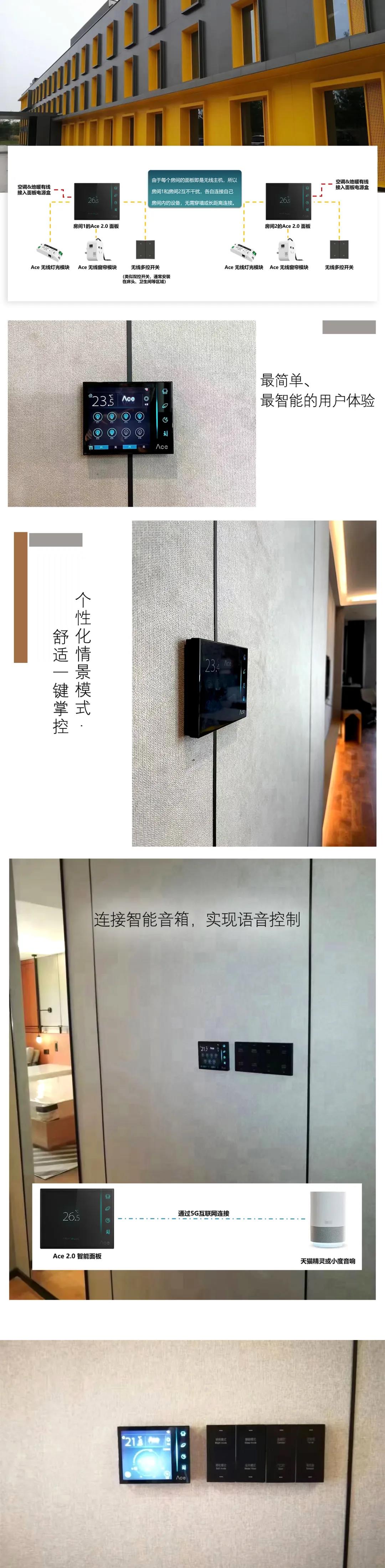 ☀ Ace 2.0 智能面板是整个无线架构的主机,无需安装RCU控制箱。灯光和窗帘的控制是通过无线ZigBee的方式;