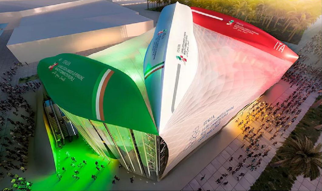 位于机遇区的意大利馆由三艘倾覆的船体组成,远远看去像绿色、白色、红色的花瓣,演绎了意大利国旗的色彩。该馆受到航海历史的启发,将世界各地的航海员及渔民的古老传统联系起来,同时采用循环装置促进建筑可持续运营。
