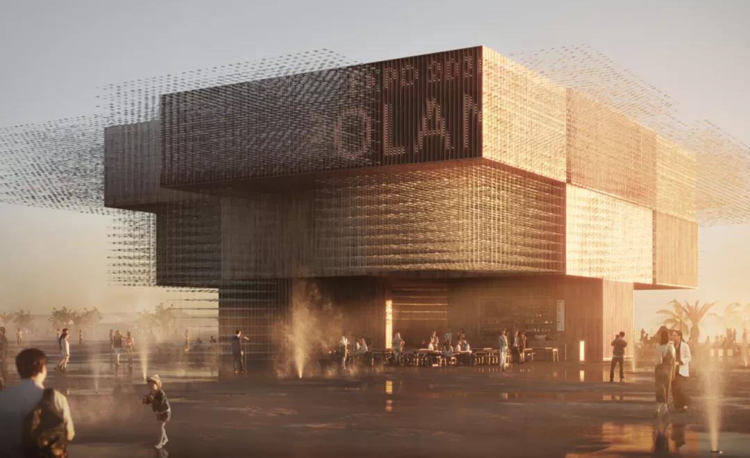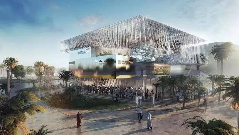 德国馆是世博园内最大的国家馆之一,融合了自然与科技的校园主题,借鉴了迪拜传统建筑风格和德国轻型展馆设计,采用通风式建筑和浮动型屋顶。展馆位于可持续性区,致力于通过展馆的枢纽体系,实现建筑在运营过程中零能耗的目标。