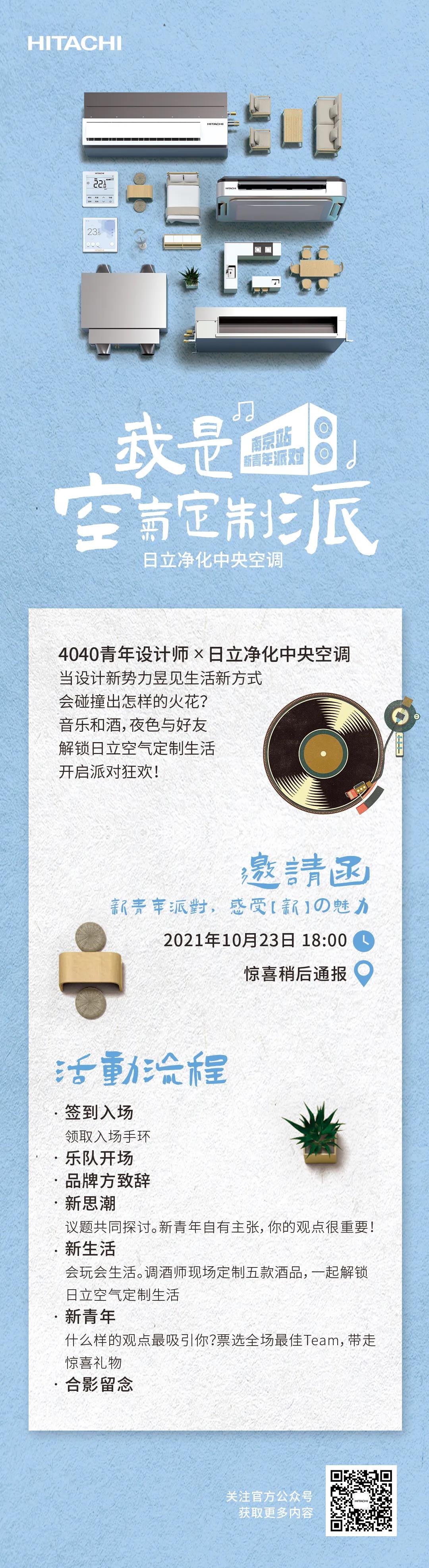 新青年派对的现场,除了新思潮与音浪相伴而来,日立中央空调五大新品也将精彩亮相,派对现场气氛势必会达到高潮。全新定制派新品昱见杰出的青年设计师,更多空气定制解决方案,更多定制派生活将在这里开启。