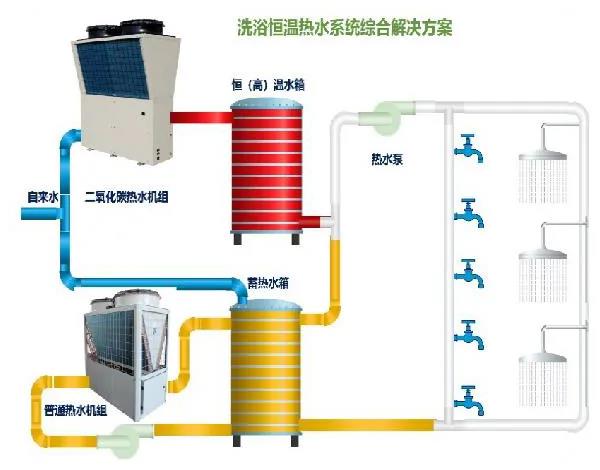 这样的需求给了二氧化碳热泵机会。二氧化碳热泵采用第四代天然冷媒CO2,具有无毒不燃、零污染、天然环保;可以实现不间断供应,运行费用较传统锅炉更少;一年四季可实现全天候运行正常,不受天气变化的影响;同时可以设置每天的定时开关机自动运行,无需专人监管;可利用夜间低谷电价制热水储存在蓄水装置中,无需专人值守;由于安装台数少,少占用商业建筑面积,安装方便,阳台、楼顶、室外等场地都可以实现,此外水电分离更安全。
