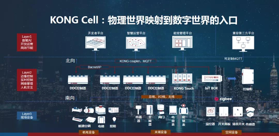 美控KONG C3 SI战略框架构建的超融合集成楼宇自控系统囊括了KONG Space集成化空间控制器、KONG Cell物联DDC、KONG Cabinet强弱电一体柜、KONG Inside控制芯片和KONG CUBE楼宇自动化开发者社区等模块。