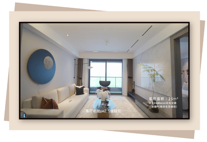 评测的客厅面积为25㎡,工作人员模拟了高浓度PM2.5的环境,PM2.5检测仪器测试值爆表。