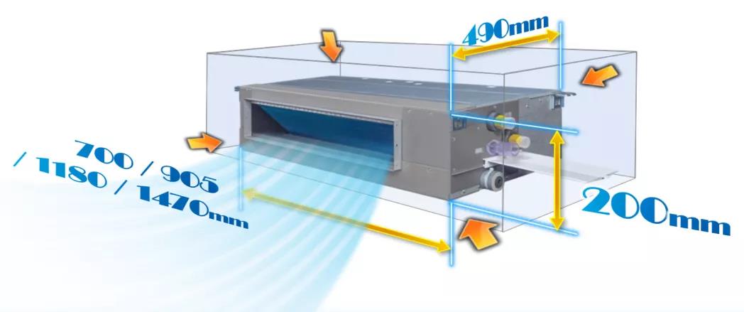 直流静音超薄型风盘拥有200mm超薄机身,能巧妙融入各种装修风格。同时,采用全封闭箱体设计,将冷量与冷凝水潮气紧锁于箱体内,提升机组效率同时降低吊顶空间内部潮气。产品还覆盖了2.1kW~7.6kW(340~1360mm³/h)家装场景常用全部容量档,可自如应用于各种户型项目中。