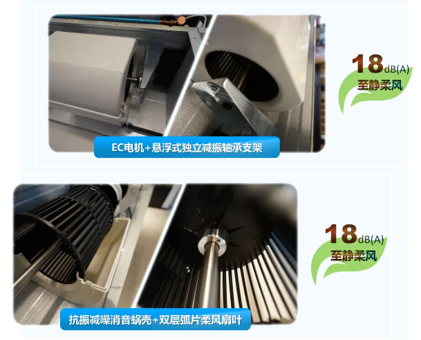 直流电机马达搭配悬浮式风机结构与独立轴承支架,配合防振减噪蜗壳与双层弧片柔风扇叶,大幅降低了电机和风扇运转音,实现18dB(A)静音运转,使整体系统平衡静音,运转稳定,安静柔和。