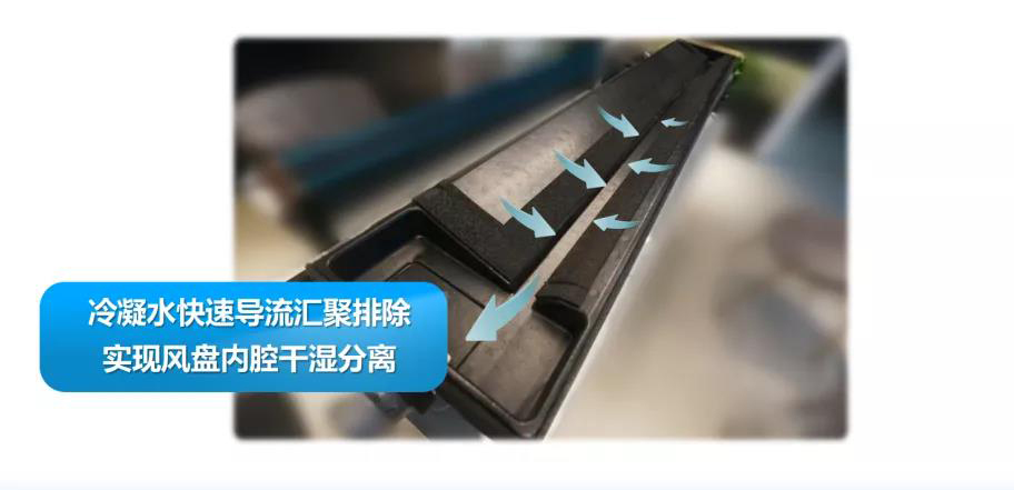 空调冷凝水排放不当会造成室内漏水,导致吊顶损坏,还会影响空调使用寿命。EK智家直流静音超薄型风盘的冷凝水接水盘采用全新快速导流结构,实现风盘内腔快速干湿分离,不仅延长机组寿命,也大大降低霉菌细菌滋生风险。