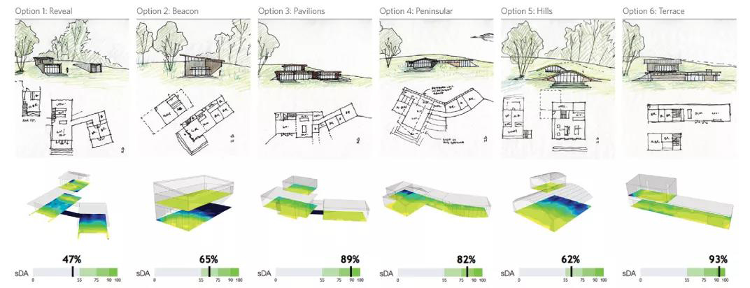零碳建筑与传统建筑的最大区别在于需要大幅降低建筑的制冷制热负荷。根据德国国际被动房协会(PHI)规范要求,被动房的全年负荷应当小于或等于10 W/m2。降低建筑负荷的主要手段是被动式设计,例如通过采取大量的自然光照明或遮阳系统来降低负荷。通过仿真计算,设计师可以得到每种不同造型情况下室内自然采光照明的数据以及用户舒适度。使用自然光照明不仅可以让用户有更好的感受,拉近与周边自然环境的距离;更重要的是减小对人造光源的依赖从而降低制冷的负荷需求。