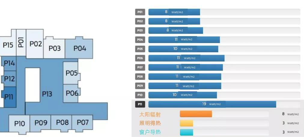 建筑能耗仿真则可以很好的规避刚刚所说的问题。通过负荷计算可以提前得到每个房间的最大制冷制热负荷。工程师根据结果准确的选择最合理的机器能力。同时这些数据将帮助工程师对不同的空间进行系统划分。例如三管制热回收多联机系统,理想情况下将同时出现冷热负荷的房间放置于同一个系统内,并且做到负荷均匀从而进一步提高系统能效。