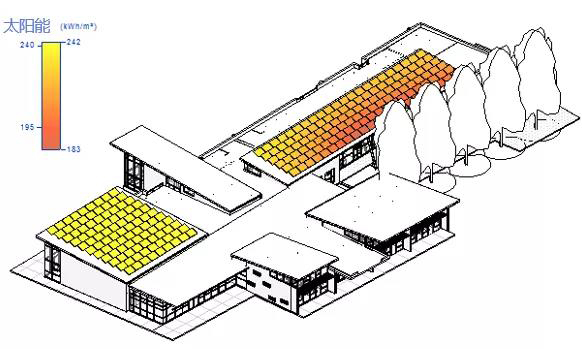 太阳能板通常被布置在屋顶。通过建筑能耗仿真工具的使用,工程师可以优化屋顶的形状来最大化放置太阳能板的面积。通过日照计算得到全年可再生能源的生产量。这样既保证了满足建筑碳中和的目标,又不会过多布置太阳能板造成场地和成本的浪费。