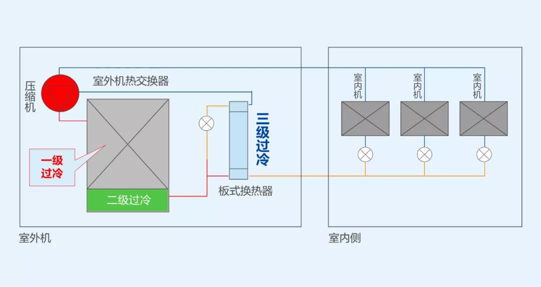室外机三级过冷设计,过冷度最高达36℃,保证系统的高效稳定;高效换热技术,一体式四面热交换器,热交换热面积大,换热效率高;另外1W低待机技术,母线共用技术,减少待机耗电量,减少能耗的同时宽范围稳定运行。