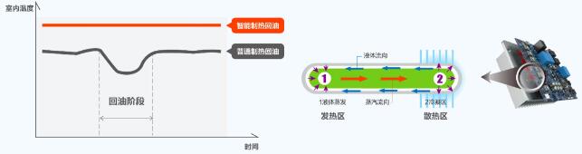 超导液冷媒散热,不占用系统冷媒冷热量,减少冷媒系统能力损耗。制热回油四通阀不换向技术,提高制热效果,制热回油不停机,运行更稳定。