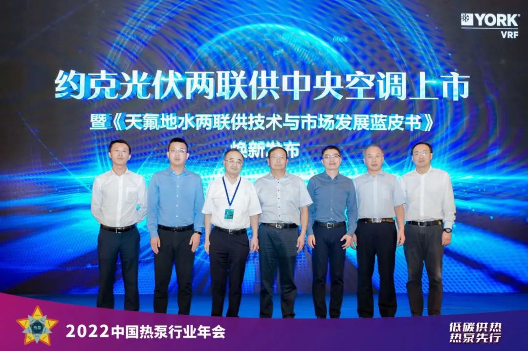 自约克VRF“天氟地水”两联供上市以来,得到了越来越多实力经销商的认可,市场销售逐渐走高。为了助推天氟地水热泵两联供产品在市场上的广泛应用提供有价值的参考,为满足用户高品质生活体验和多样化采暖空调热水等需求提供坚实后盾,中国节能协会热泵专业委员会与约克VRF联合主编、修订《天氟地水热泵两联供技术与市场发展蓝皮书》2022新版。在发布会上,中国节能协会热泵专业委员会主任房庆、中国节能协会秘书长宋忠奎、中国节能协会热泵专业委员会副理事长高屹峰、上海交通大学教授丁国良;青岛江森自控空调有限公司约克事业部副总经理肖冰、市场推广部总经理李云峰、新风事业部总经理陈启,共同为约克光伏两联供上市暨“天氟地水”两联供技术与市场发展蓝皮书进行了揭幕。