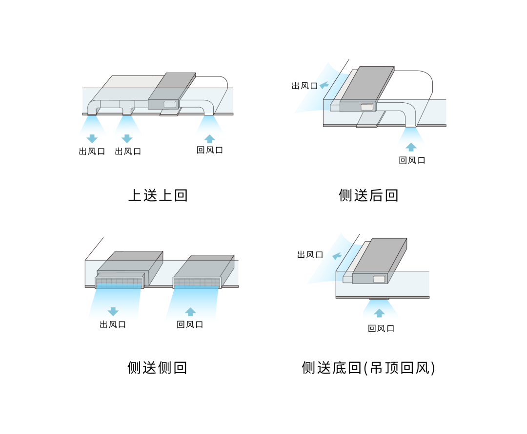 日立中央空调采用高位送风,气流自上而下均匀覆盖,无送风死角。可根据房间结构采用上送上回、侧送后回、侧送侧回、侧送底回等多种送风方式,气流组织更优异,温度分布均匀,为人体带来更舒适的空气感受。