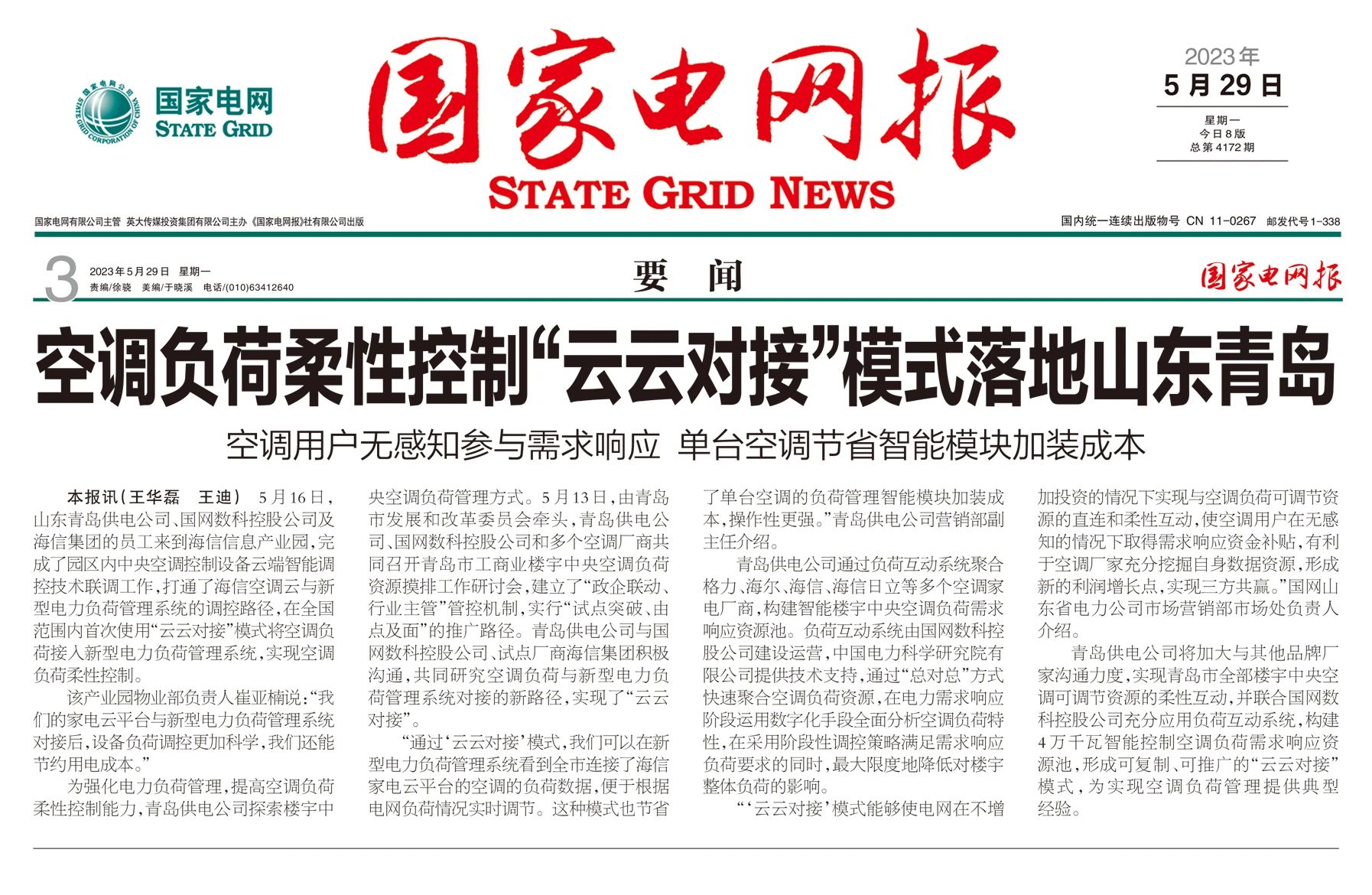 近日,国家电网报刊出一篇题为《空调负荷柔性控制“云云对接”模式落地山东青岛》的报道:日前,海信中央空调、山东青岛供电公司以及国网数科控股公司的技术人员在海信信息产业园,共同完成了园区内海信中央空调控制设备云端智能调控技术联调工作。此举打通了海信中央空调云与新型电力负荷管理系统的调控路径,在全国范围内首次使用“云云对接”方式实现空调负荷柔性控制。