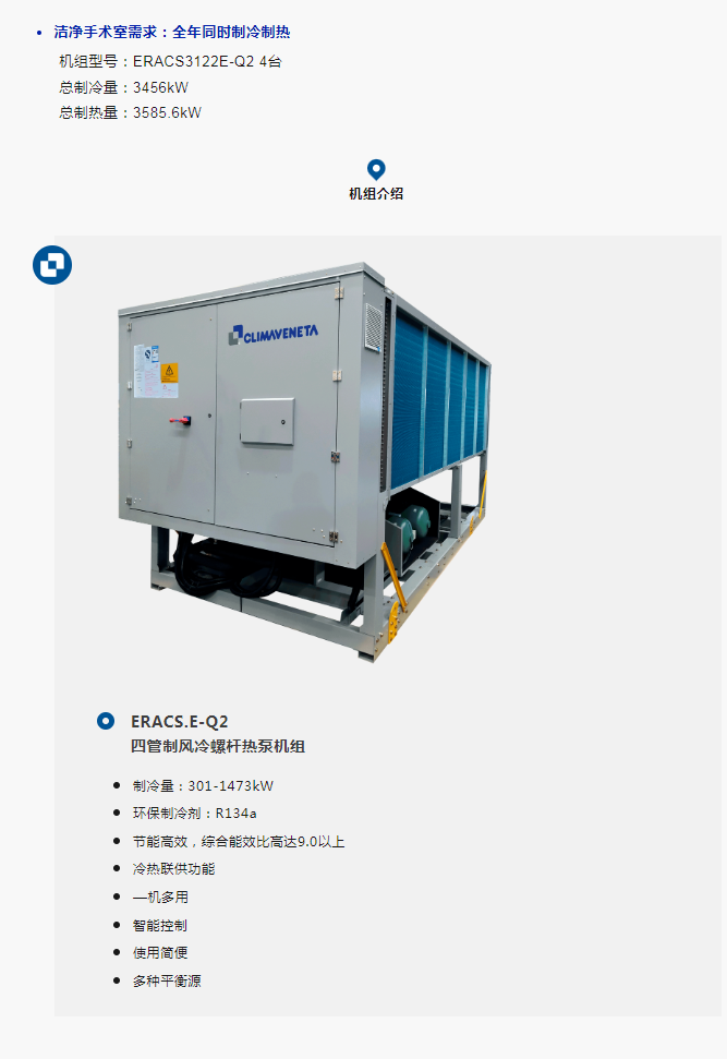 克莱门特结合徐汇区南部医疗中心自身条件,分别在南楼屋顶、综合楼屋顶、北楼屋顶、中楼屋顶、裙房屋顶放置机组,采用新型两管制风冷热泵和四管制风冷热泵机组,为门诊诊区,手术室,洁净室等区域解决夏季制冷,冬季制热,以及全年同时冷热和卫生热水需求,真正实现绿色医院解决方案。