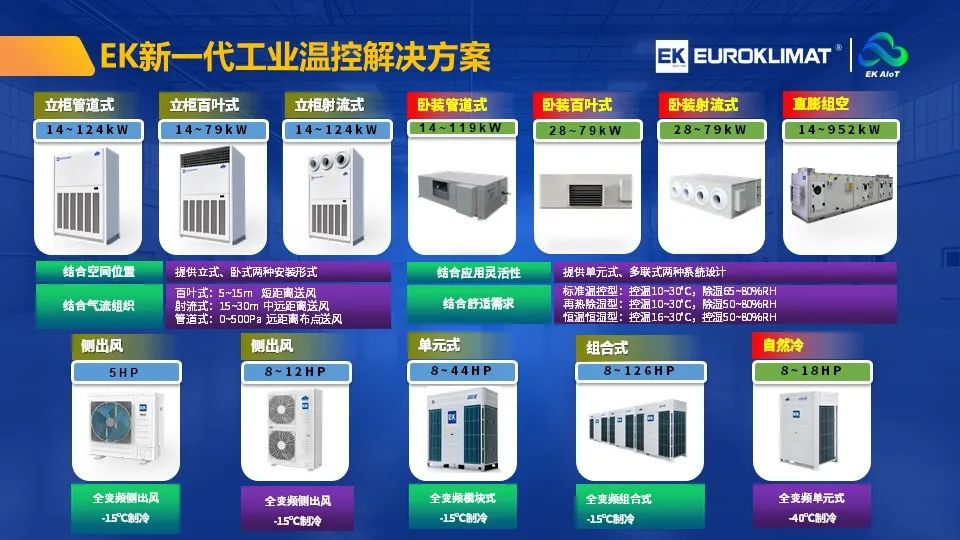 EK工业多联采用变频及自然冷节能技术,提供管道式、百叶式、射流式多样化送风形式,结合应用灵活性提供单元式、多联式两种形式,产品涵盖标准冷暖型、再热除湿型、恒温恒湿型,全面满足制造厂房、配电房、仓库等工业常见温控场景需求。