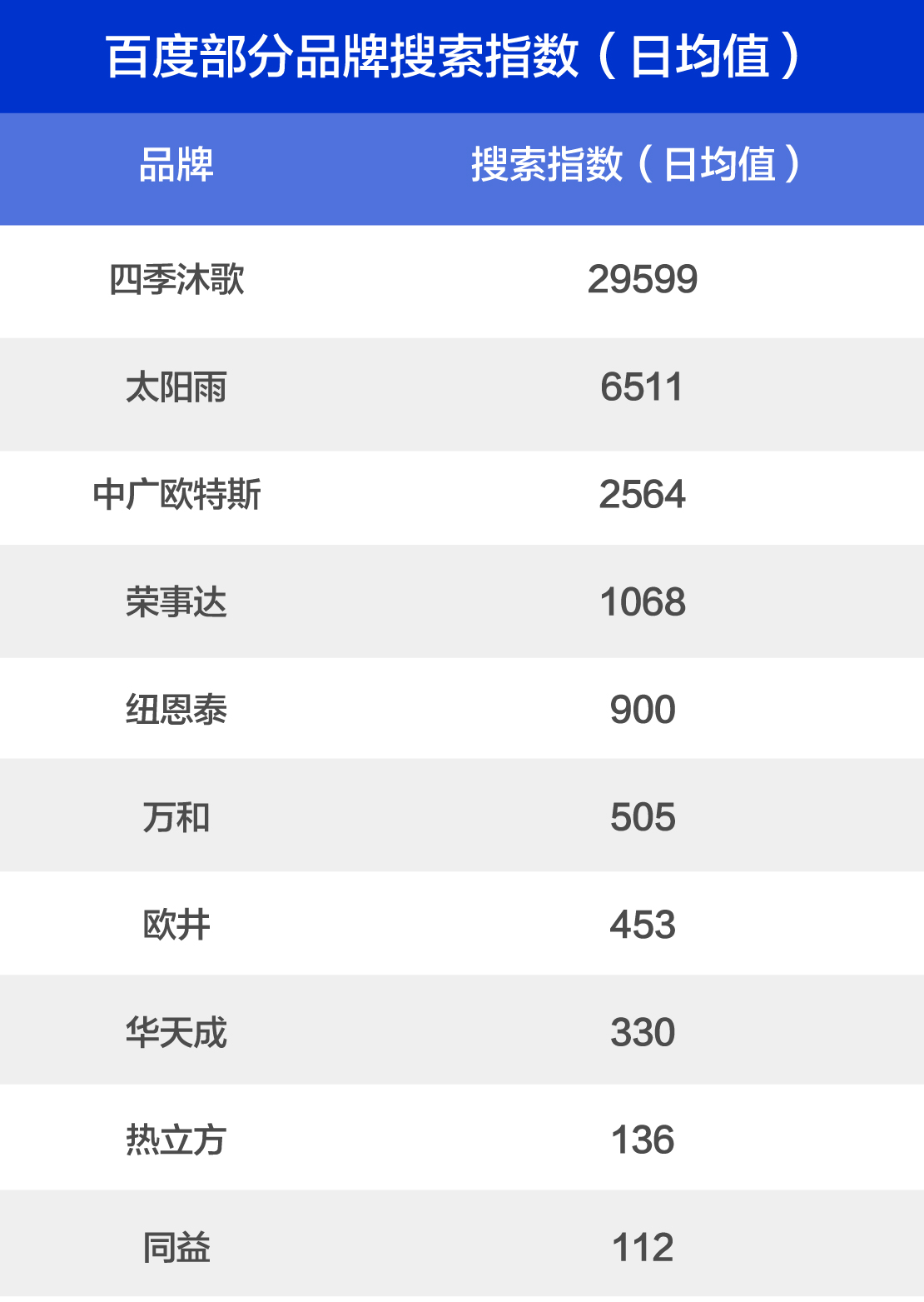 数据显示,四季沐歌在百度搜索引擎中遥遥领先,说明四季沐歌在塑造品牌投入方面更加注重。太阳雨空气能与中广欧特斯,同样深谙流量之道,这彰显了近年来热泵品牌影响力持续增强,成功俘获大批消费者的信赖。然而,部分品牌因战略调整等因素,在互联网上的曝光度有所降低。