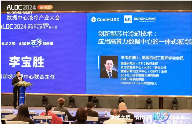 EK空调高度重视液冷技术创新,联合新加坡国立大学共同研发液冷和液冷热回收等系统解决方案。在此次行业盛会上,新加坡国立大学李教授发表题为《创新型芯片冷却技术:应用高算力数据中心的一体式液冷防漏冷板》的主题报告。李教授指出,算力需求推动着数据中心功率密度不断提升,能耗与发热量也随之攀升,传统风冷方案已难以满足IT设备的散热需求。