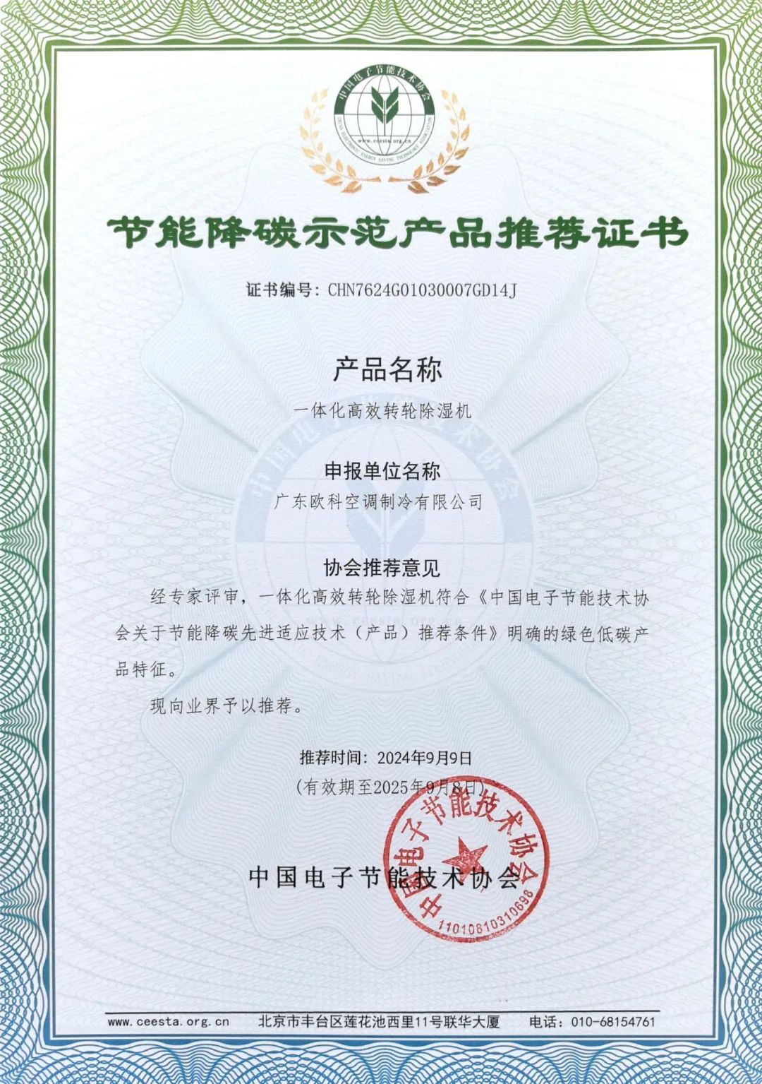 近日,EK工业空调旗下一体化高效转轮除湿机、三管制恒温恒湿机、云智慧高效集成冷站等产品,凭借出色的节能降碳优势,成功通过中国电子节能技术协会的专家评审,被授予“节能降碳示范产品推荐证书”。这是业界对EK工业空调技术创新实力的肯定,也是对EK空调在绿色科技领域持续贡献的认可。