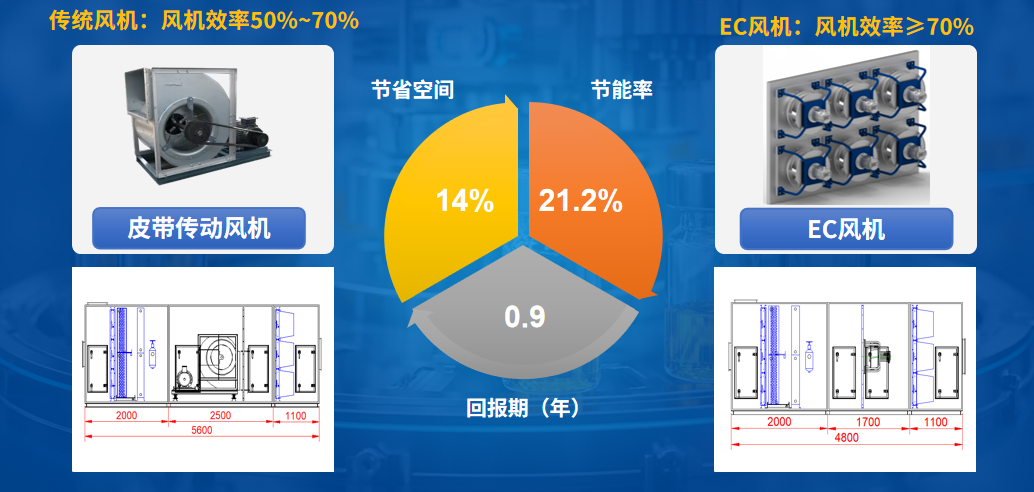 EK工业空调发起EC变频普及风暴,用“EC风墙”技术提升风机运行效率和备用安全,对比传统风机节能率高达21.2%,同时节省空间14%。