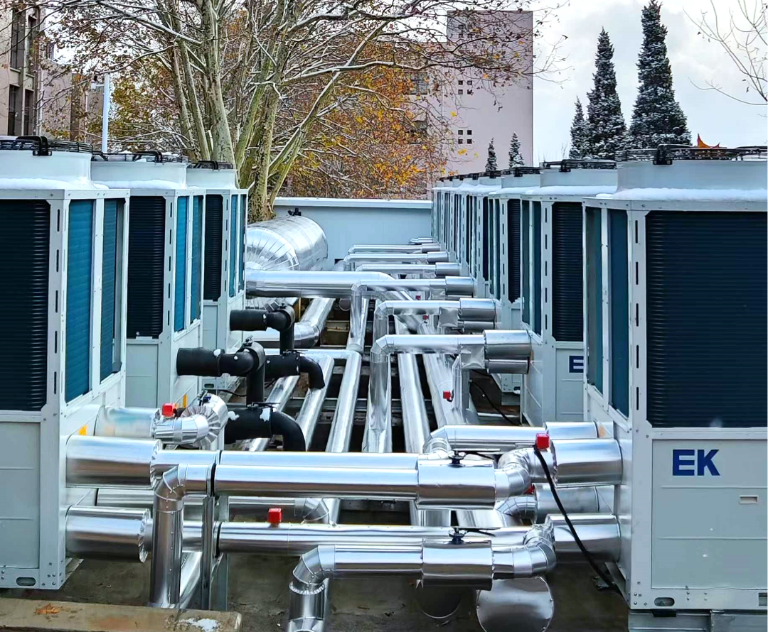EK团队深入分析项目需求,共配置24台EK超低温空气源热泵机组,结合“超低温性能+模块化设计+智能调控”三大技术优势,为每栋建筑量身定制绿色智能解决方案。