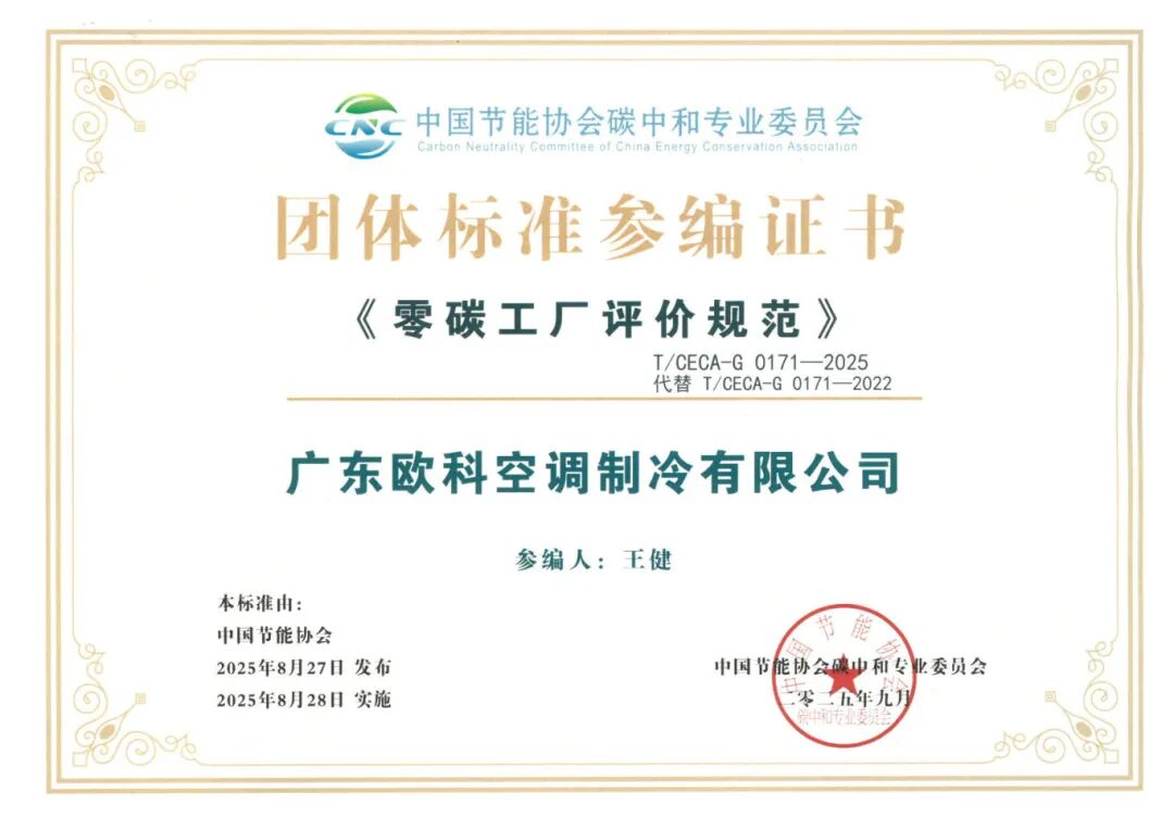 近日,中国节能协会正式发布实施新版《零碳工厂评价规范》(T/CECA-G 0171-2025),为零碳工厂建设提供更科学、更系统的指引。EK工业空调凭借在节能低碳领域的深厚积累,深度参与标准起草修订工作,成为该团体标准的主要起草单位。