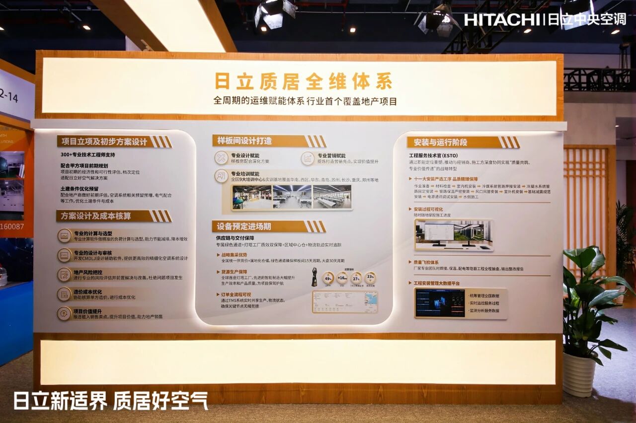 本届展会,“日立质居全维体系”同时重磅发布。作为行业首个覆盖地产项目全生命周期的运维赋能系统,该体系致力于从前端设计、中期施工到后期运维,为项目提供全链路、系统化的品质保障,真正实现从提供产品设备到全周期价值的服务升级。