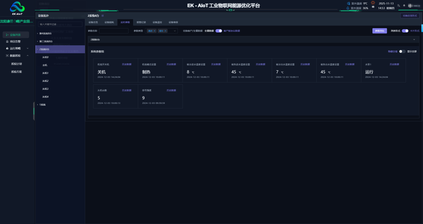 - 高区23台空气源热泵机组,搭配暖气片末端,采用10℃大温差设计,保障住宅区冬季室内温度恒定。AIoT系统不仅可以实时查看机组运行状态、运行参数、还可以智能诊断设备异常并提前预警,无需专人看管,降低人力成本,管理更便捷。