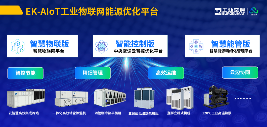 这是EK工业空调自主研发的一套集智能控制、智慧运维,并与环控场景、工业4.0应用场景深度结合的工业物联网智能化管控平台,是以数据智能为核心驱动,对各应用场景全生命周期进行云端价值赋能,旨在提供“云+边”端智能控制、远程运维、线上协同、节能增效等端到端一体式解决方案,充分发掘应用场景节能价值和管理价值。