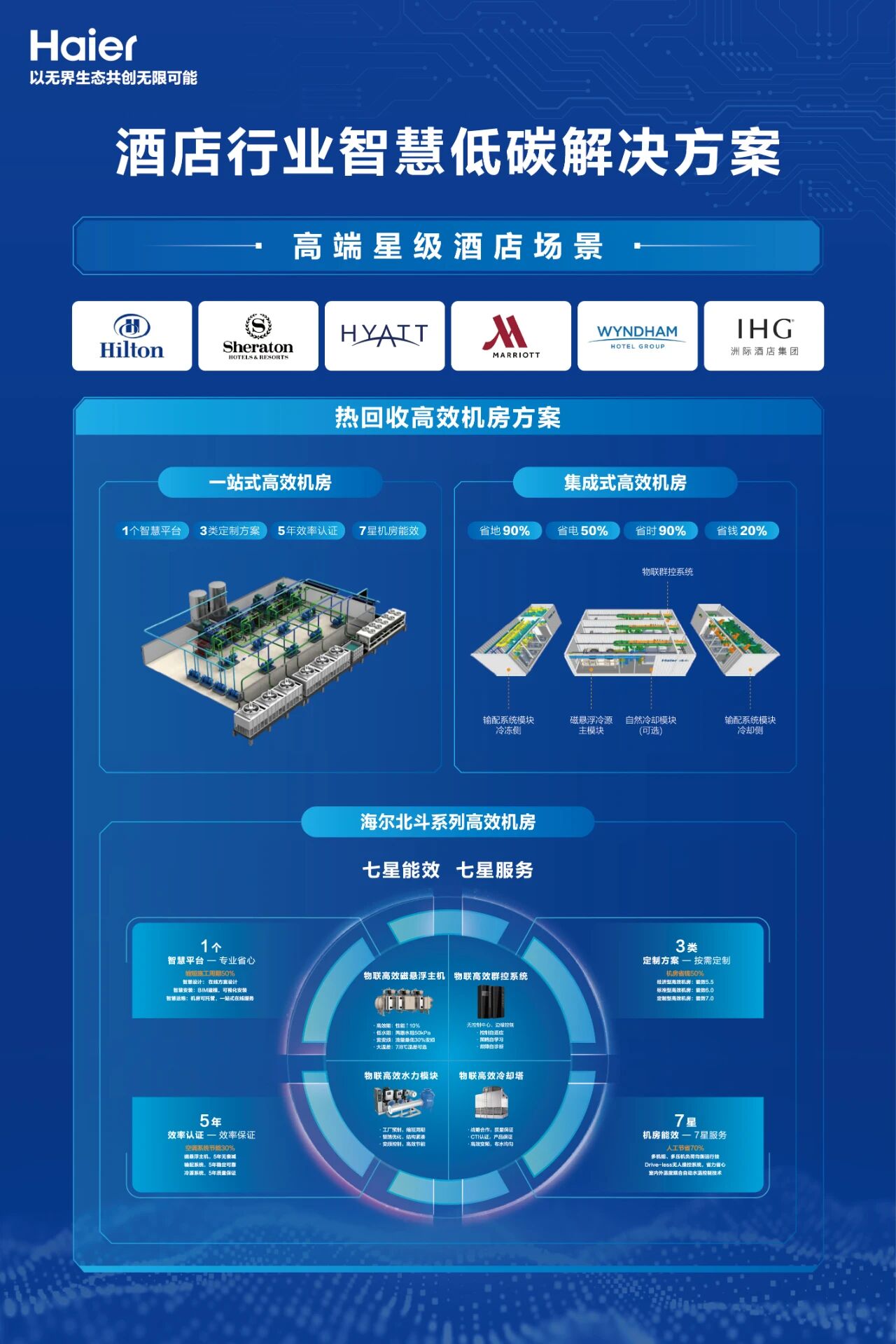 高端星级酒店对温控精度、静音性能及空气品质的要求极为严苛,这正是海尔磁悬浮的核心发力点,搭配热回收高效机房等方案,兼顾节能与智慧管理。其中,“一站式”机房依托智慧平台提供定制保障,“集成式”机房可省地90%、省电50%,结合北斗高效机房七星级服务,形成覆盖智慧平台、节能认证与专业运维的完整体系。