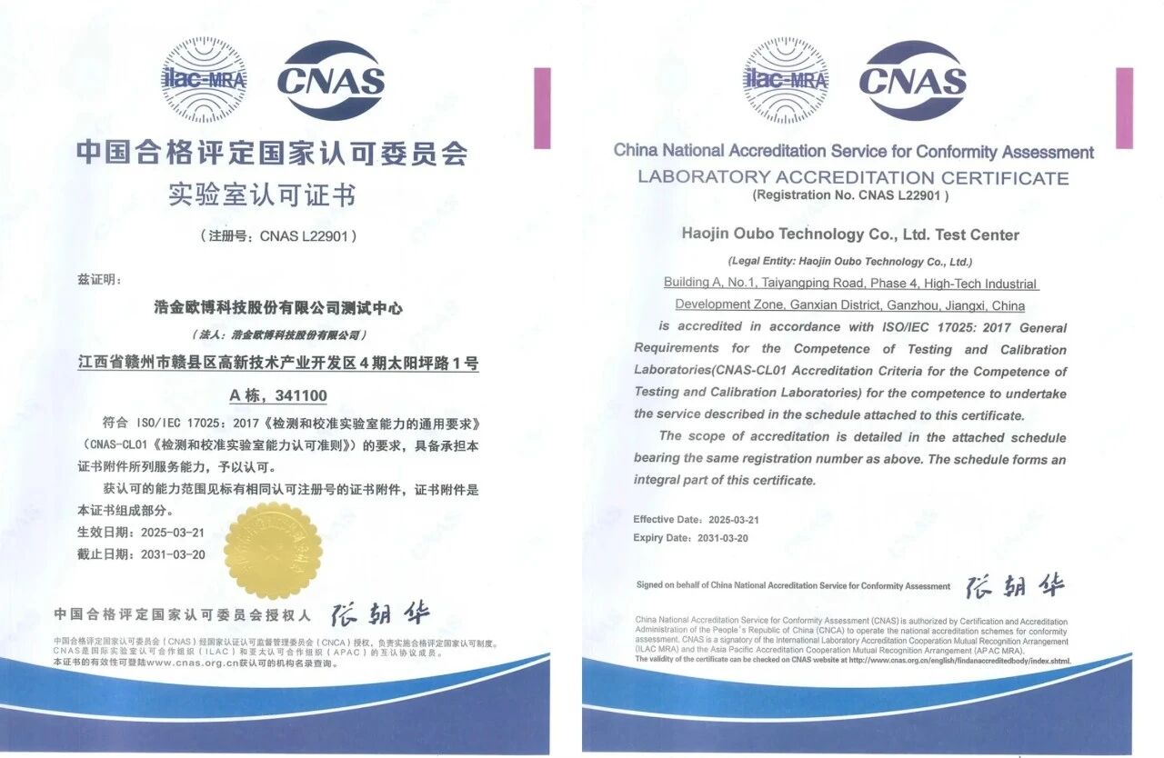 欧博空调测试中心荣获国家级CNAS实验室认可证书,是对研发与检测实力的高度认可;