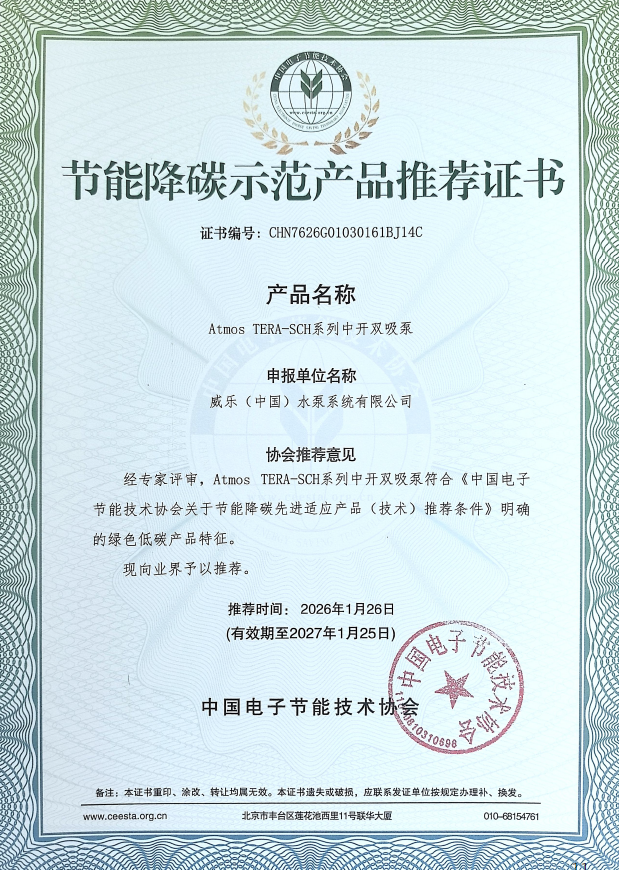 近日,威乐的王牌产品系列Wilo-SCH系列中开双吸泵产品,正式获得由中国电子节能技术协会颁发的“节能降碳示范产品推荐证书”,这一成绩标志着Wilo-SCH系列产品在能效性能、安全可靠及环保方面均达到了国家最高标准,是威乐践行可持续发展承诺、助力中国建筑、工业与市政领域绿色转型的又一重要里程碑。