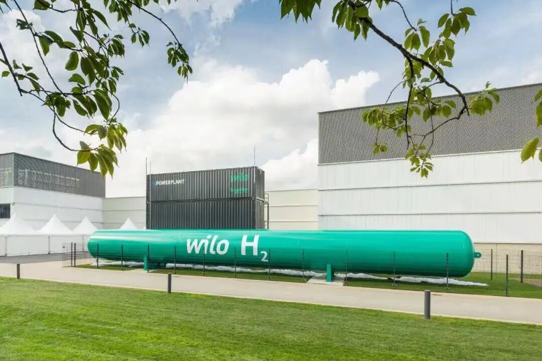 威乐集团始终积极探索清洁能源的应用。2022年公司通过跟施耐德、Enapter等公司合作,研发了一套氢能发电系统并安装在了集团总部WiloPark。该模块化产品利用智能工厂屋顶光伏系统捕获的能源生产绿色氢气,并储存在29.8米长罐体中。目前该项产品技术已经成熟,并在德国汉堡大学等地开始商业应用。