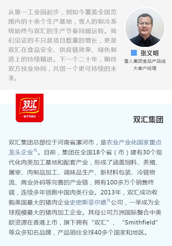 二十年风雨同舟,雪人集团将继续与双汇并肩,创新驱动,行稳致远,共赴美好未来!