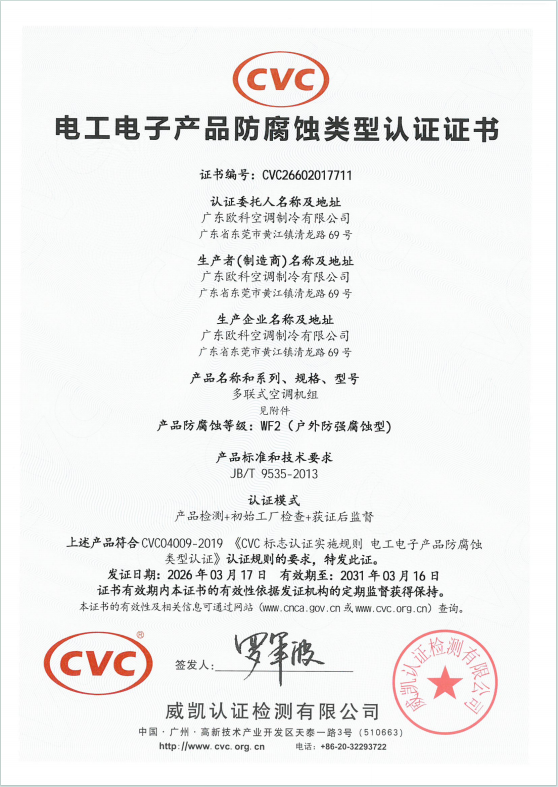 近日,EK工业多联机组通过行业权威机构腐蚀试验:二氧化硫气体腐蚀试验验证,正式获得F2(户内防强腐蚀型)防腐蚀认证证书和WF2(户外防强腐蚀型)防腐蚀认证证书,标志着EK工业空调突破技术壁垒,在高湿度、高盐雾、化学腐蚀这类恶劣环境的应用中更上一个台阶。