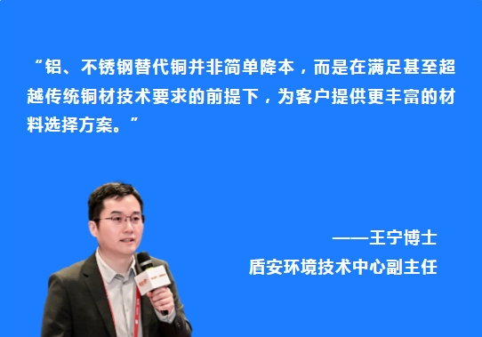 盾安环境技术中心副主任王宁博士应邀参加并作《空调行业以铝、不锈钢代铜的发展与展望》主题报告,结合盾安在微通道换热器、阀件、管路件等关键部件的应用实践,指出这一趋势主要受成本、资源战略、技术突破与环保理念多重因素共同推动。