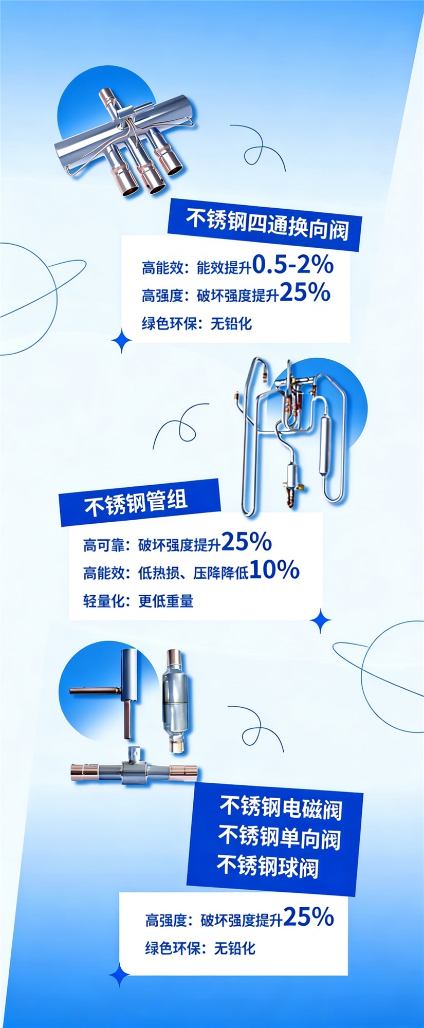 这一观点的背后,是盾安环境在不锈钢代铜领域长达16年的技术深耕与规模化应用。针对早期不锈钢材料加工成型难度高、无法直接火焰焊接、加工精度要求高等行业痛点,公司2016 年起开展不锈钢加工技术研究,已形成成熟稳定的不锈钢产品研发制造体系,凭借深厚的技术积累与卓越产品力,自主研发的不锈钢四通阀、不锈钢管组市场占有率稳居全球第一。