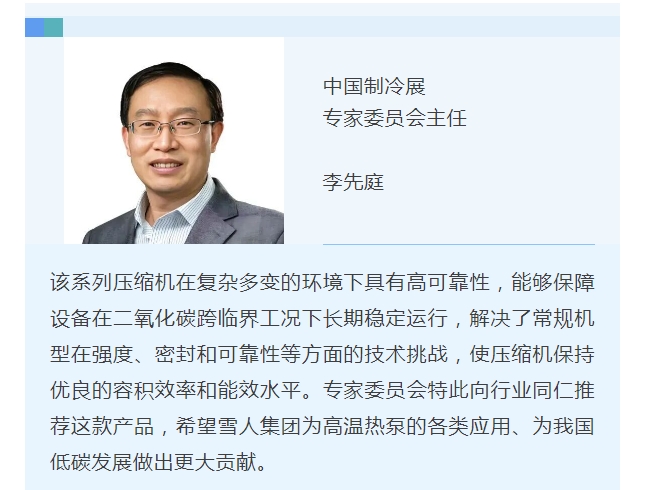 中国制冷展第二日,制冷展专家委员会主任,清华大学李先庭教授出席“雪人时刻”庆典仪式,代表委员会对雪人集团SPT系列二氧化碳跨临界活塞压缩机(工业版)进行点评。