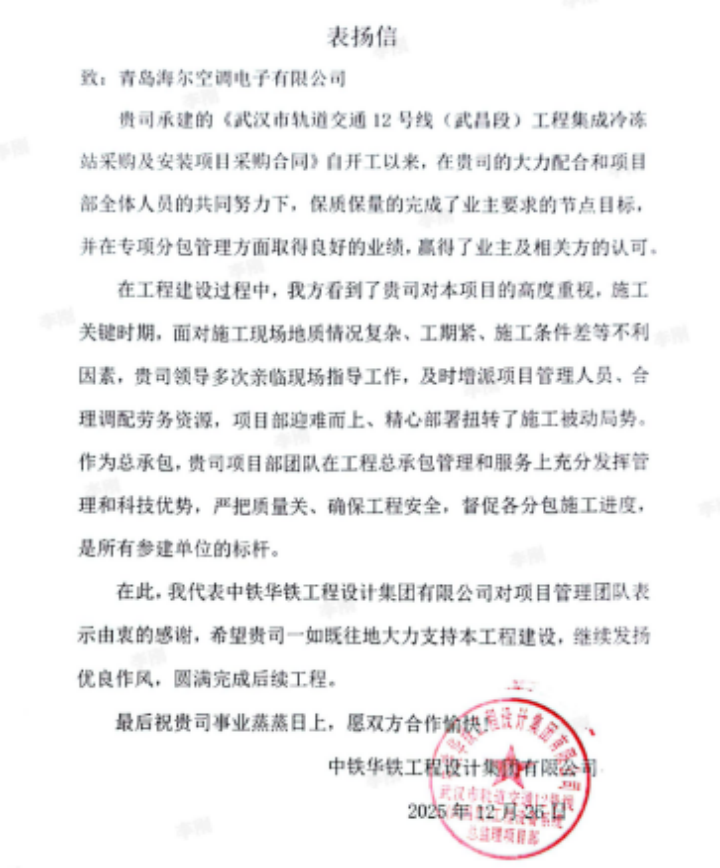 2025年,海尔承接青岛地铁多条线路的设备供货、质保及委外维保工作。工程履约团队在6号线一期、4号线、3号线、2号线二期等线路中持续提供稳定可靠的服务保障。其中6号线一期荣获地铁集团“优秀单位”称号,4号线维保项目连续多个季度获评优秀,3号线维保平稳运行,2号线二期供货顺利推进。地铁集团对海尔一年来的表现非常认可,授予海尔集团公司“优秀单位”奖牌。