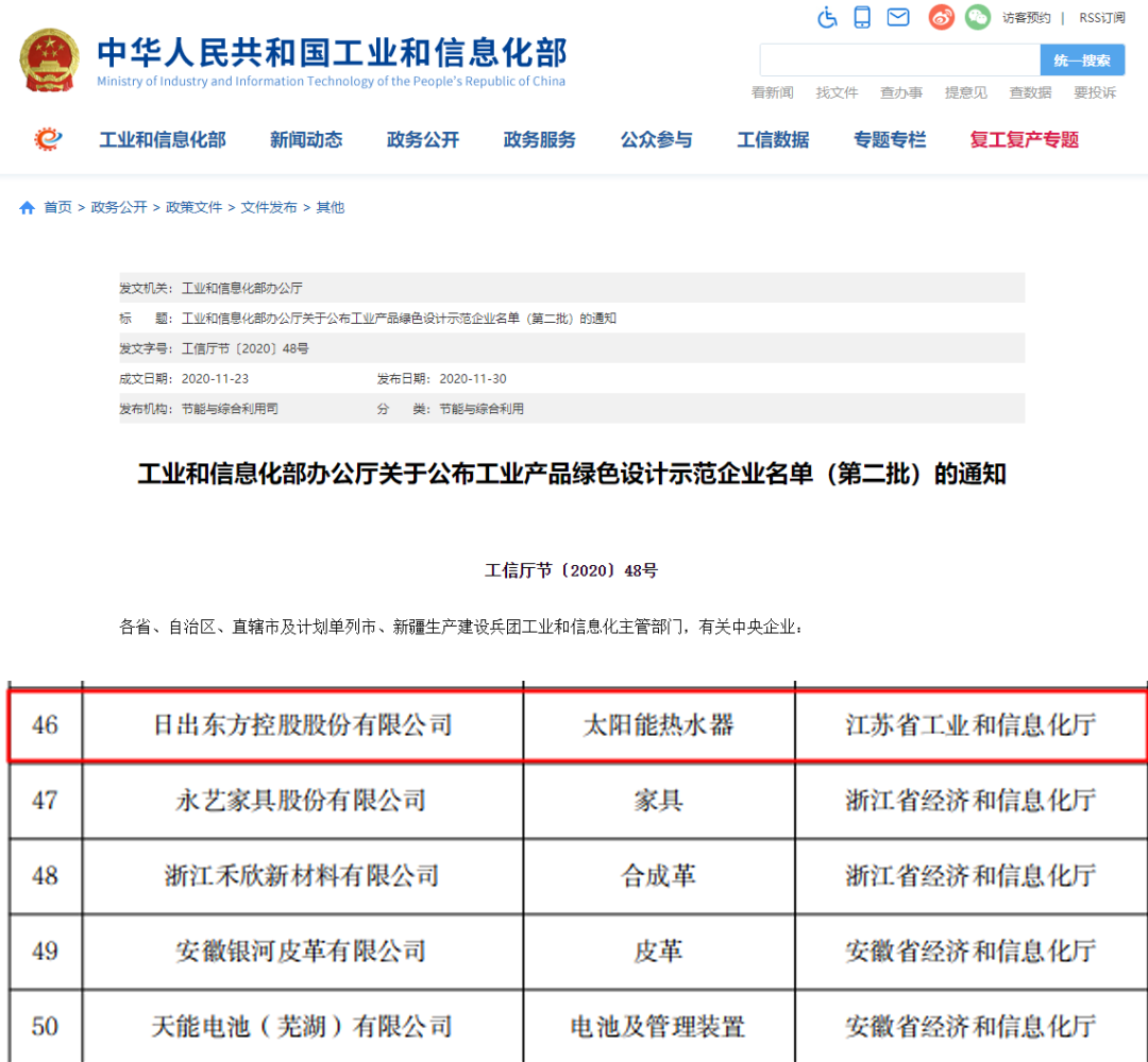 11月30日,工业和信息化部发布了《工业和信息化部办公厅关于公布工业产品绿色设计示范企业名单(第二批)的通知》,太阳雨集团获评第二批工业产品绿色设计示范企业。
